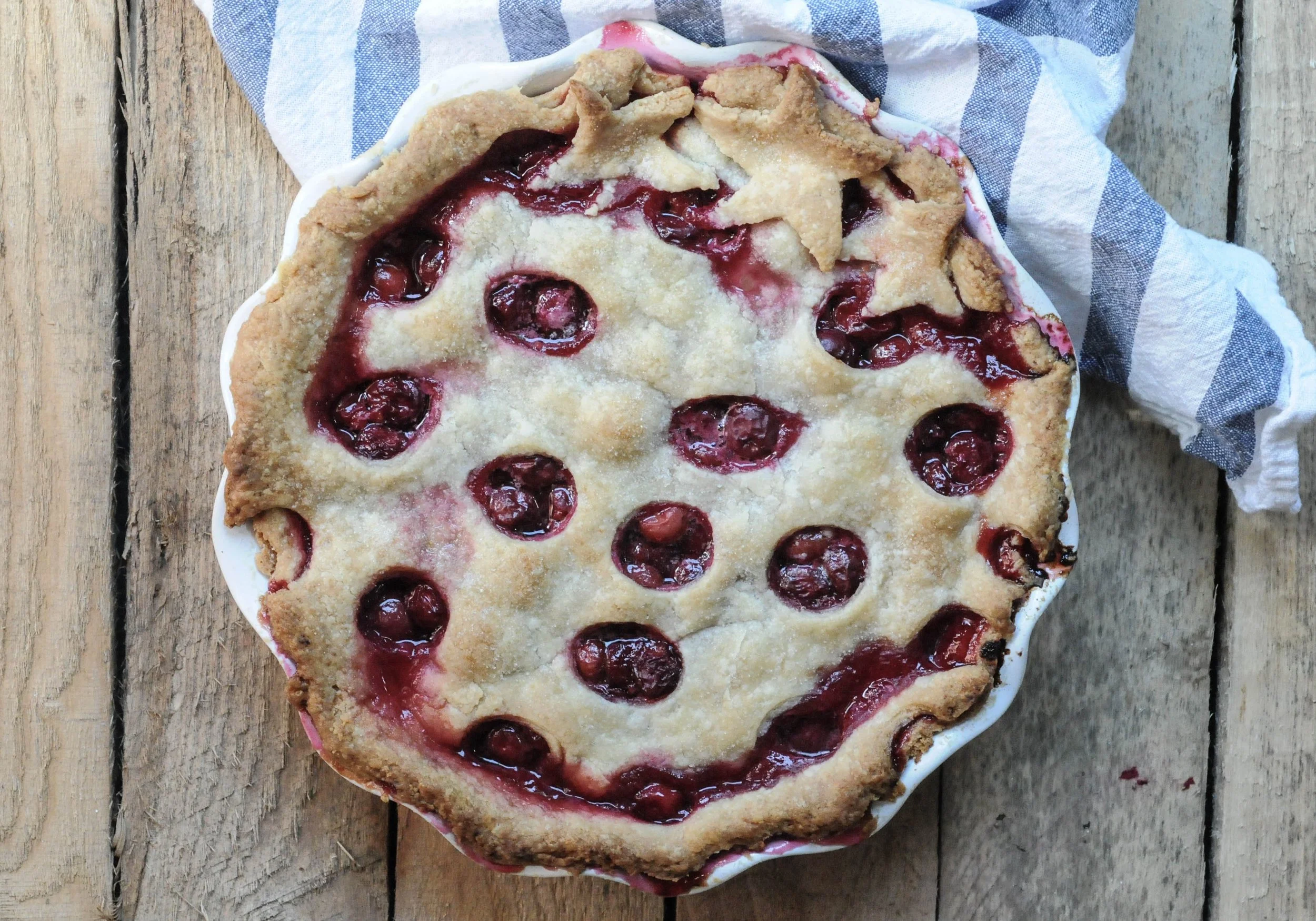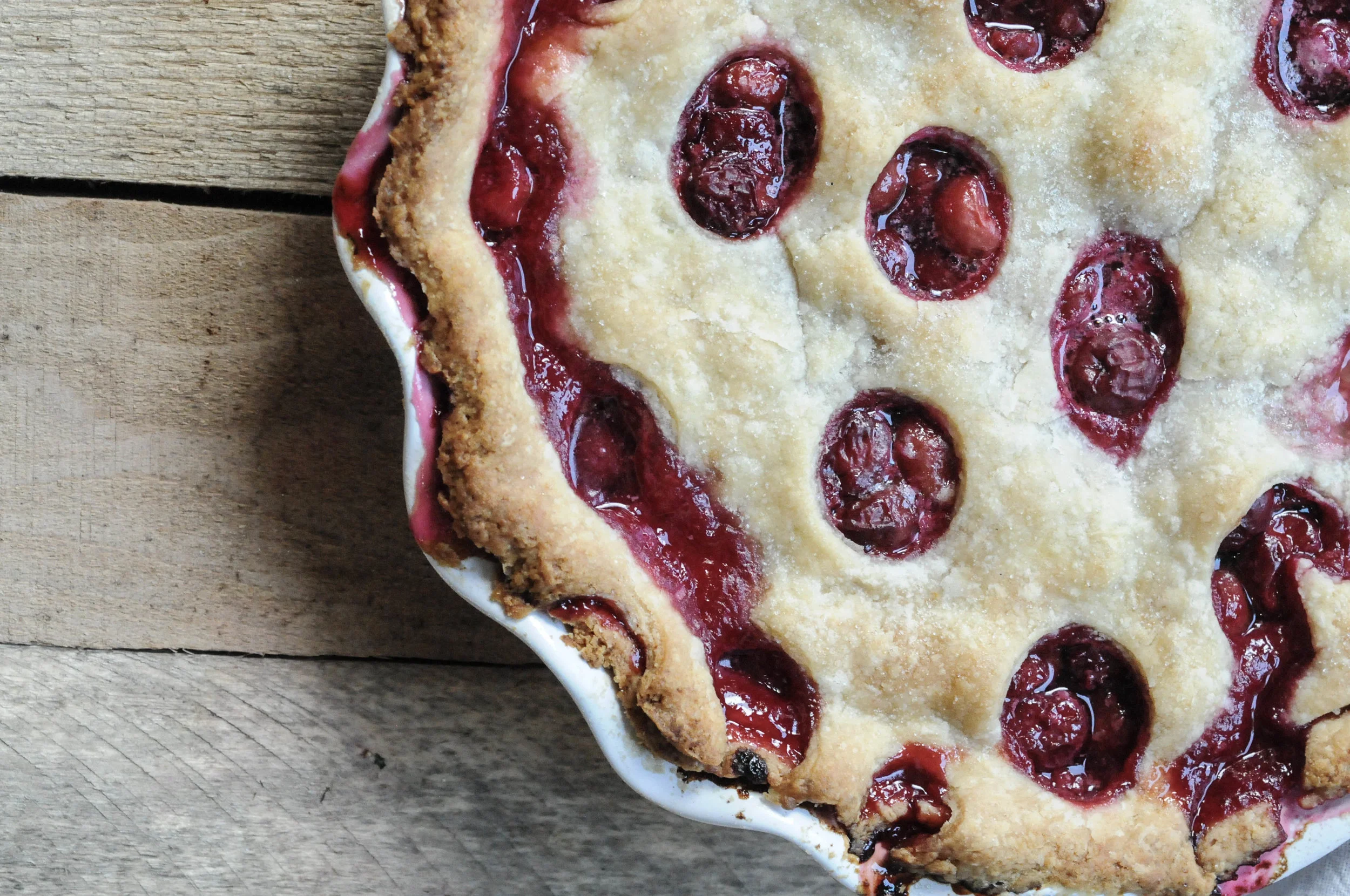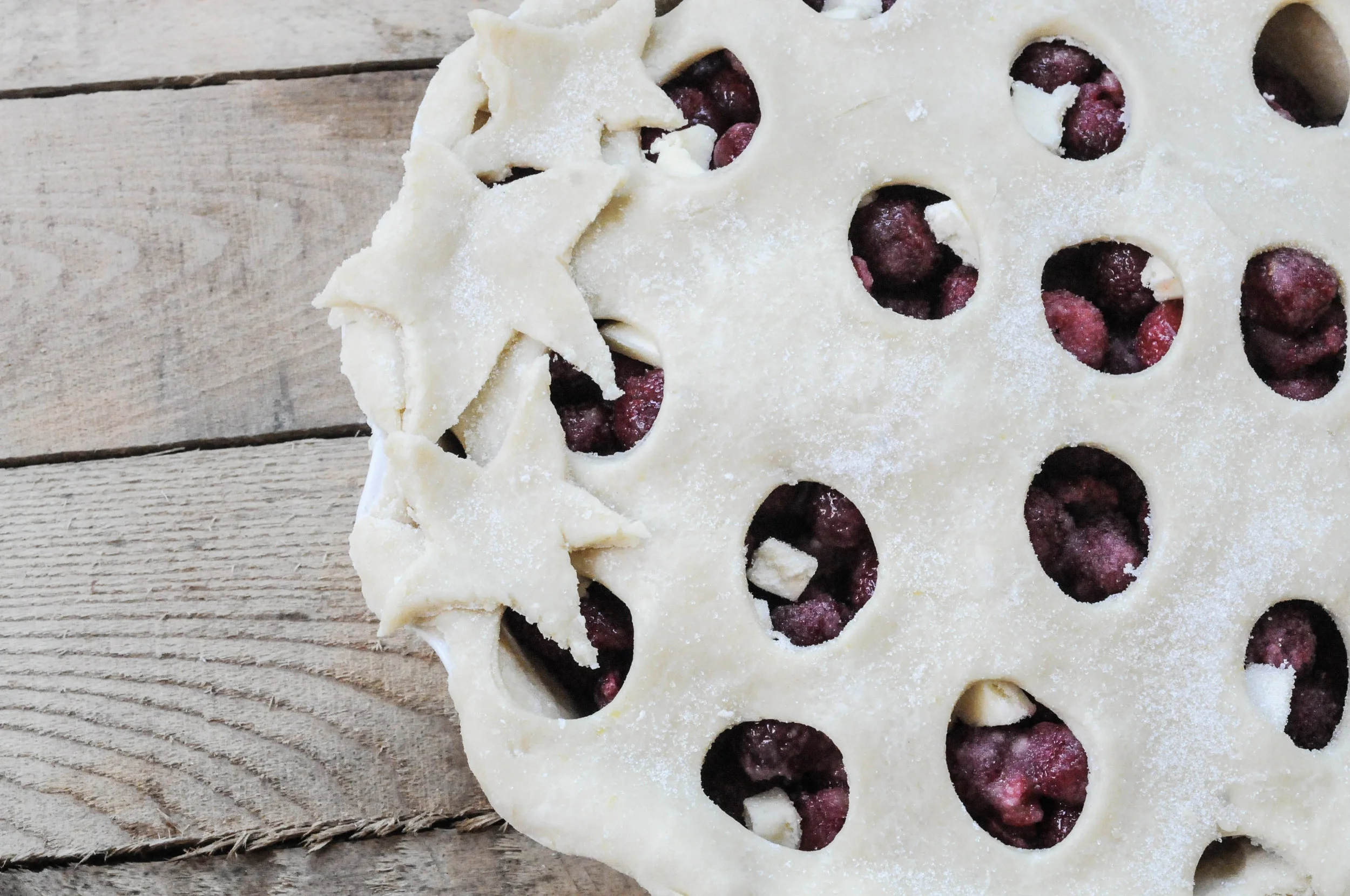 Make the top crust: Take out the second disc of dough and either roll it out and place it over the cherries, or make a lattice top. Here, I rolled it out and then used a small lid to cut small circles all over the top.